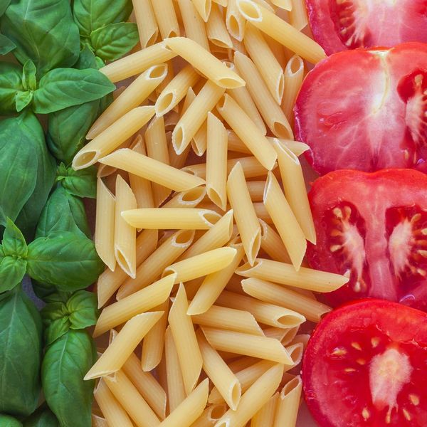 spaghetti pasta with veggies topped with tomato either vodka sauce